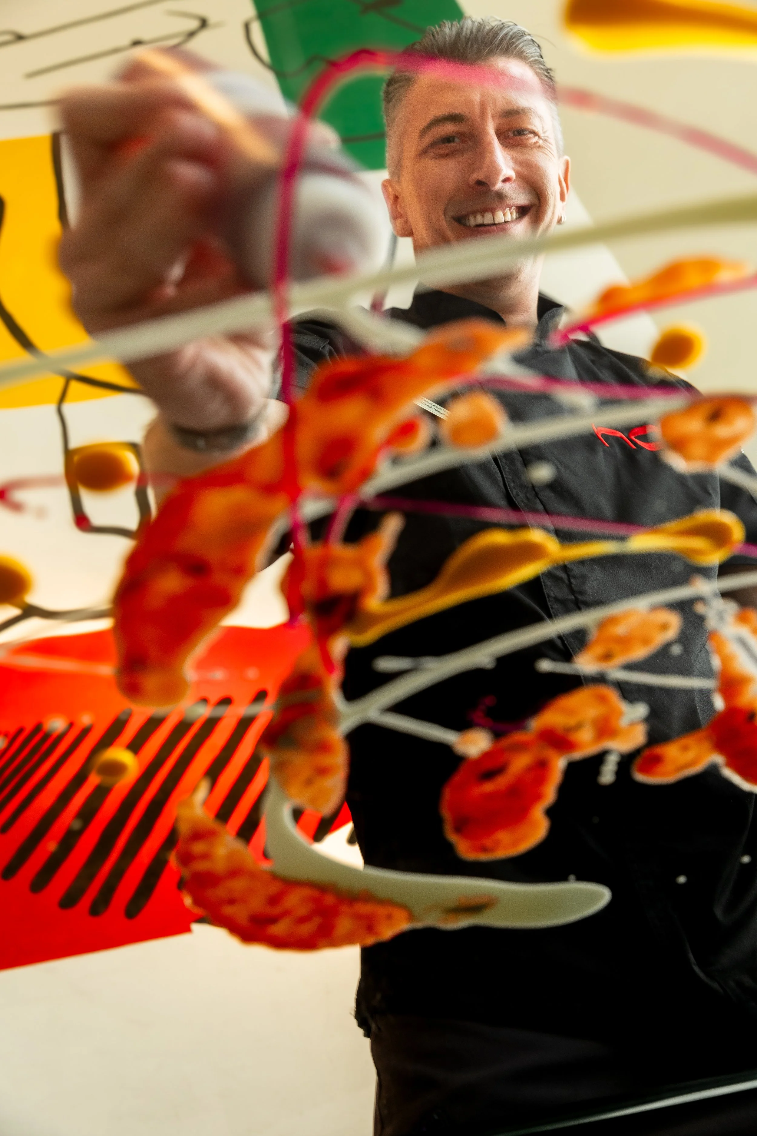 Chef creating abstract art with vibrant splashes of red, yellow, and orange sauces on glass.