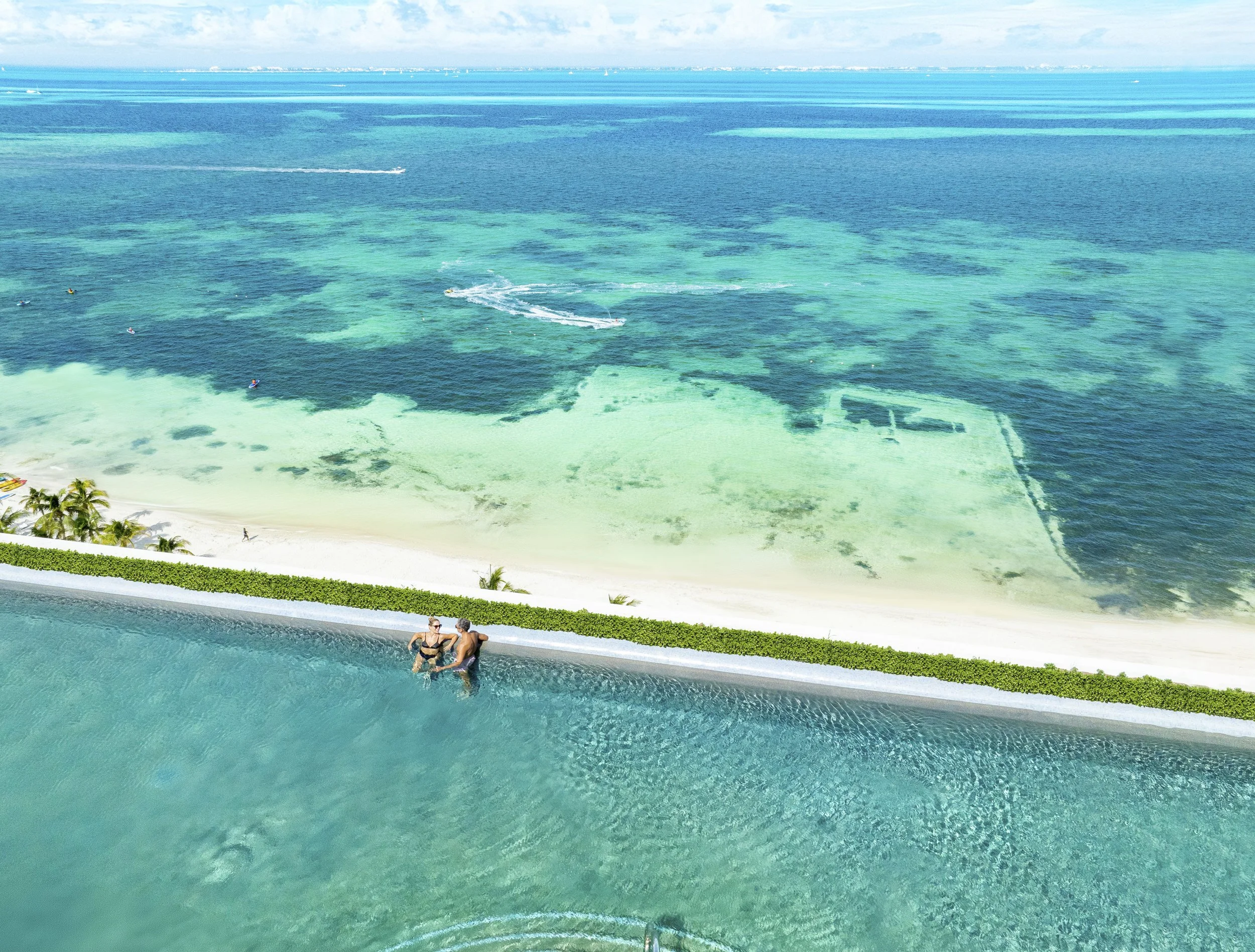 Aerial view of people in an infinity pool overlooking a beach and the caribbean ocean.
