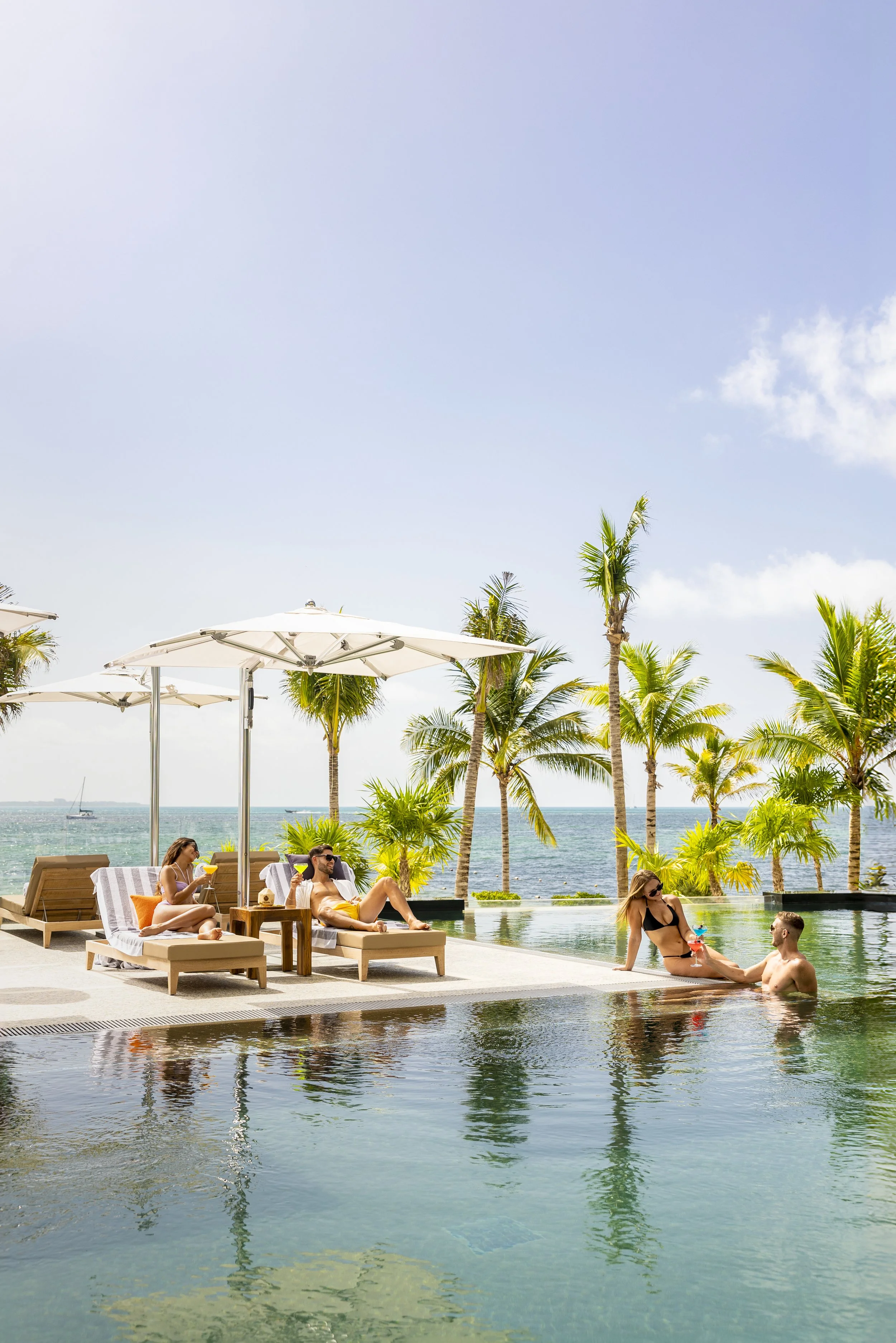 People relaxing in a swimming pool with drinks, surrounded by palm trees and Caribbean ocean view.