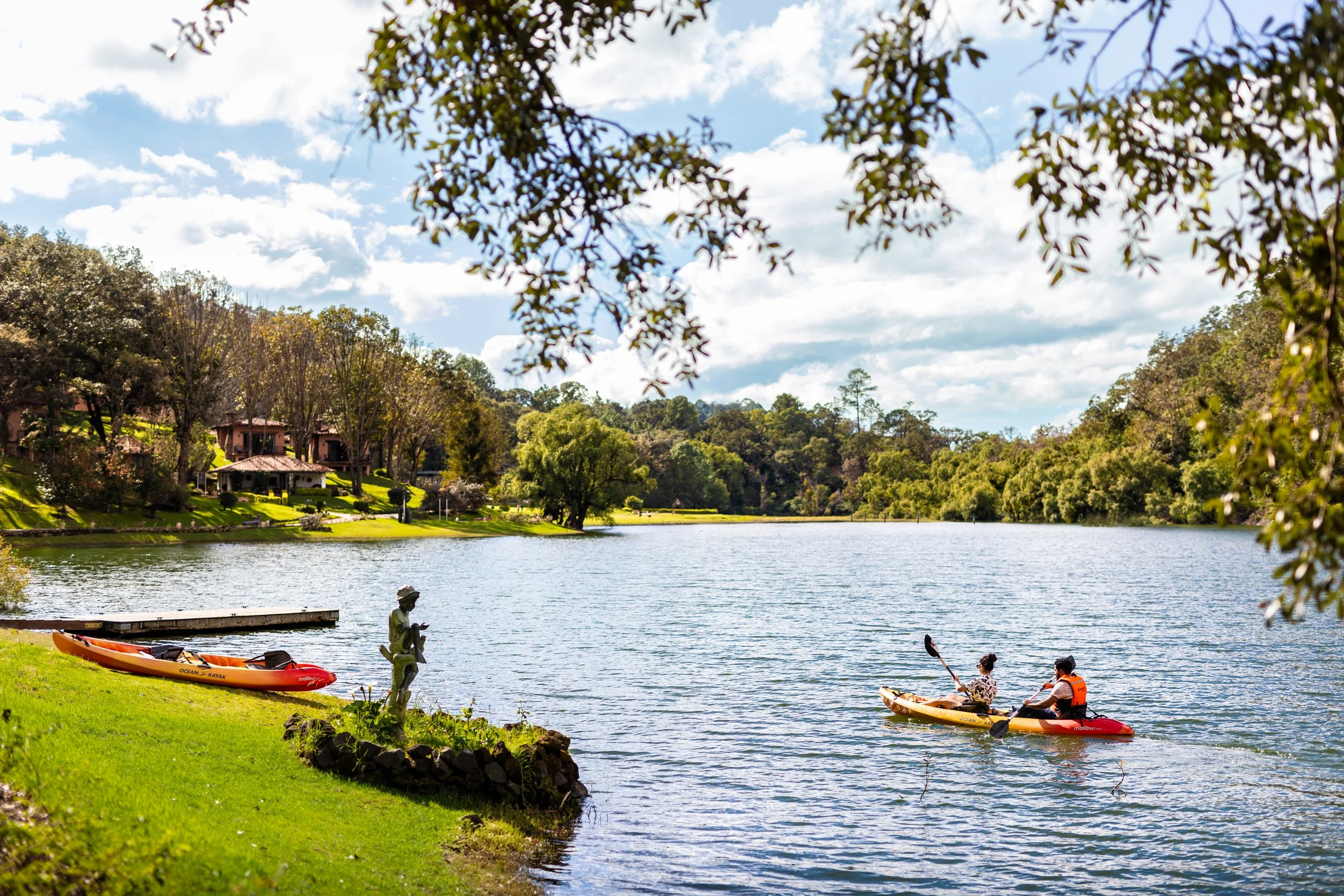 Two people kayaking on a lake, surrounded by trees and greenery, with a statue and a kayak on the shore.