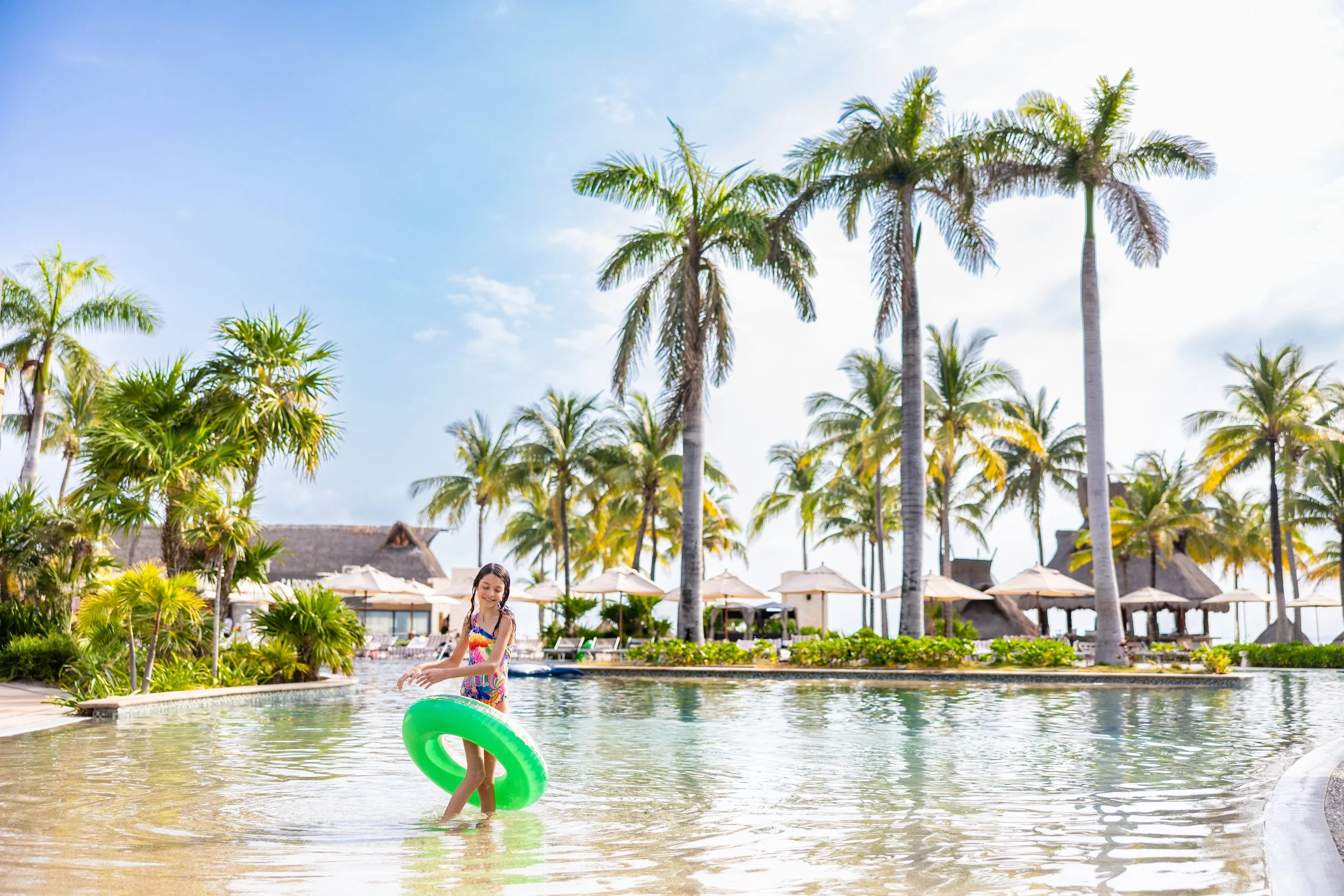 Child playing with green inflatable ring in pool with palm trees and umbrellas in background.