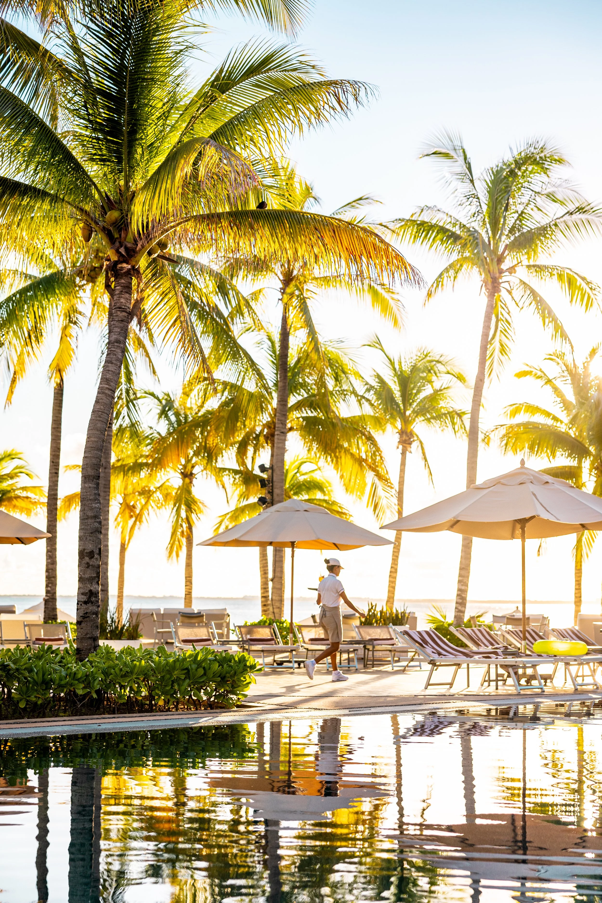 A person walking beside a pool surrounded by palm trees, lounge chairs, and umbrellas under a sunny sky.