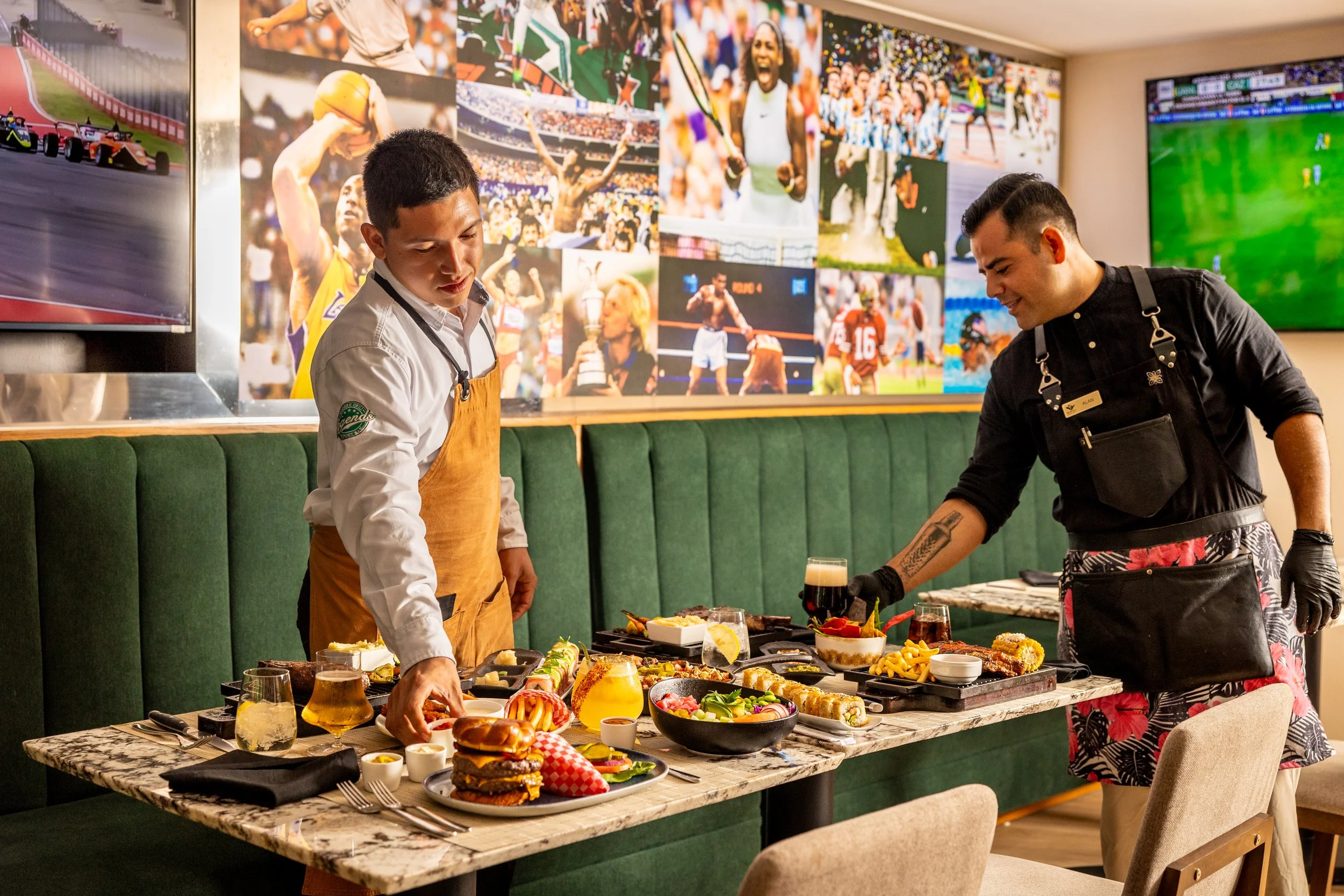 Two servers arranging food on a table in a sports-themed restaurant, with various dishes including burgers, fries, and drinks. The walls feature sports images, and televisions display sporting events.