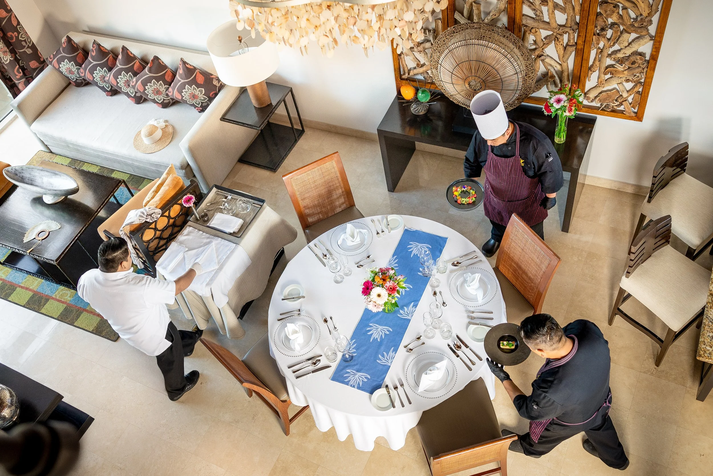 Overhead view of a formal dining setup with two chefs arranging dishes, a set table with white tablecloth and floral centerpiece, and a worker preparing napkins nearby.